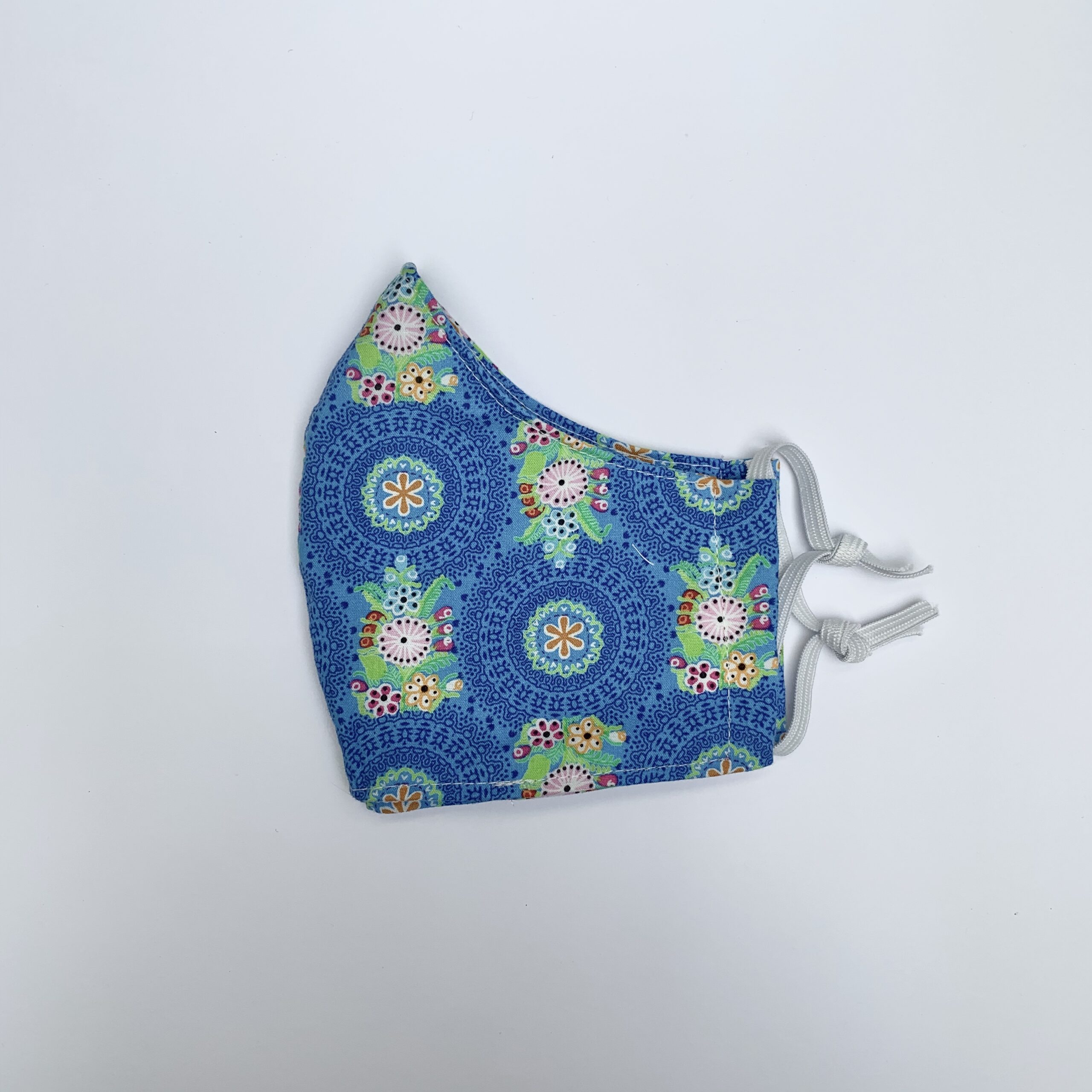 Dit mondkapje is helderblauw en heeft print met cirkels en kleine bloementrosjes.