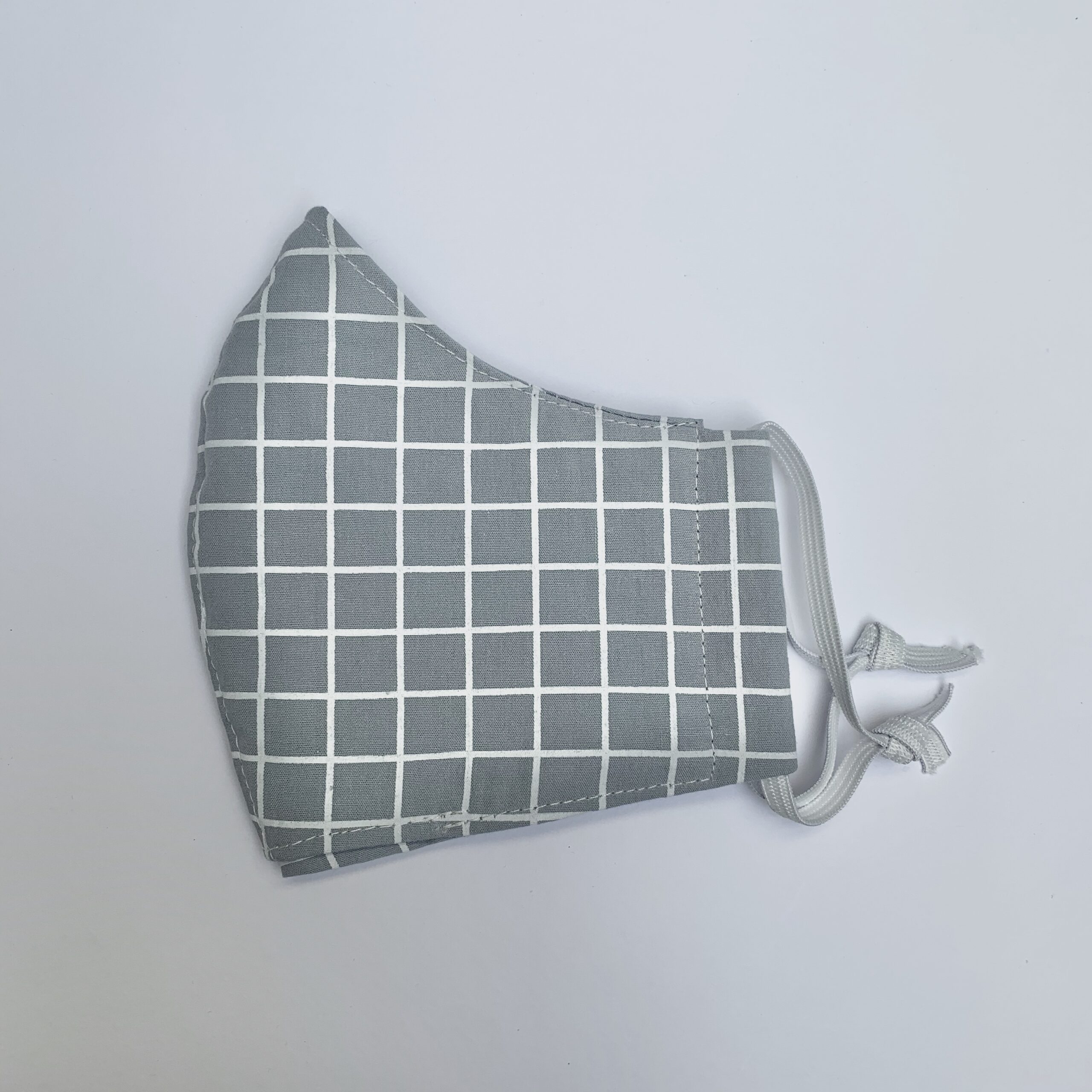Dit mondkapje is gemaakt van een ruitjesstof. De witte lijnen vormen ruitjes op een grijze achtergrond.